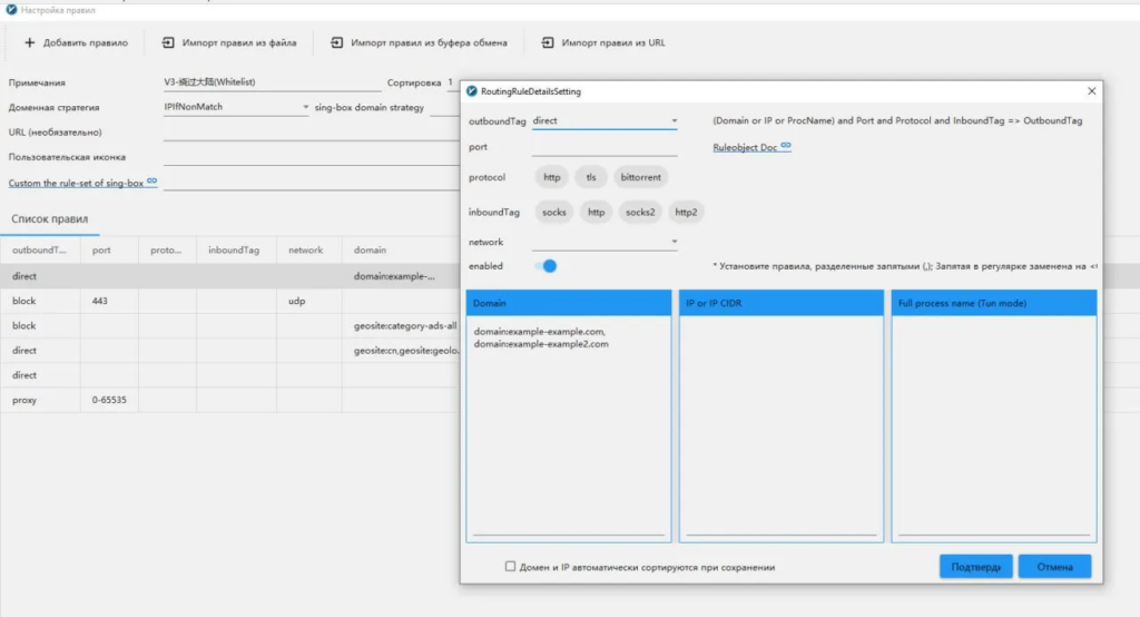 - Далее, выберите RU_Whitelist и отредактируйте первое правило типа «direct»: добавьте в него через запятую: